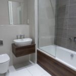 Beautiful bathroom fitted with a white suite comprising bath with rainfall shower over, low suite w.c. and vanity unit wash basin. Tiled floor and part tiled walls. Shaver point, recessed spot lights and two large heated towel rails.