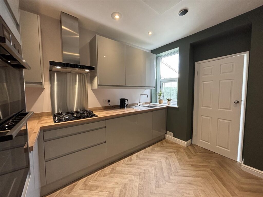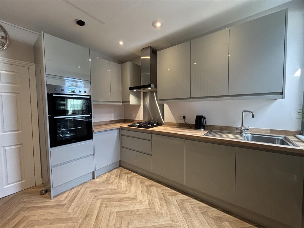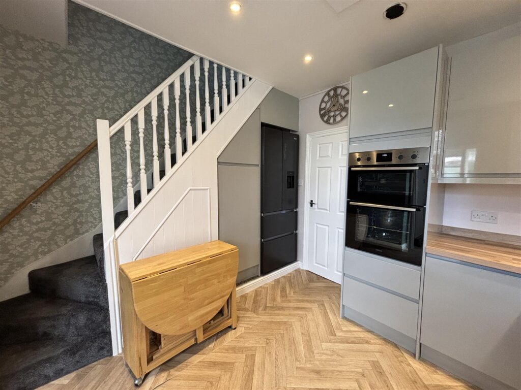 Recently fitted kitchen with a range of wall mounted cupboards, base units and drawers, fridge/freezer, dishwasher, oven, microwave, gas hob and UPVC double glazed window to the rear.