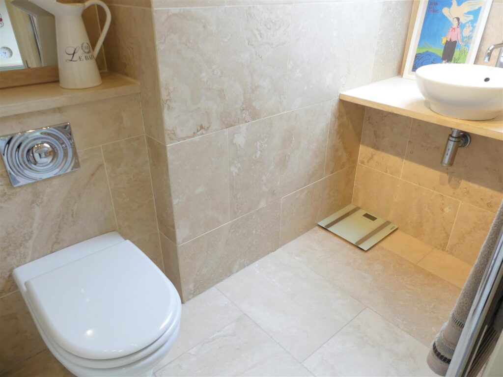 Fully Travertine tiled and fitted with a low suite e.c. and hand wash basin. There is also a heated towel rail, LED spotlights and a Velux window.