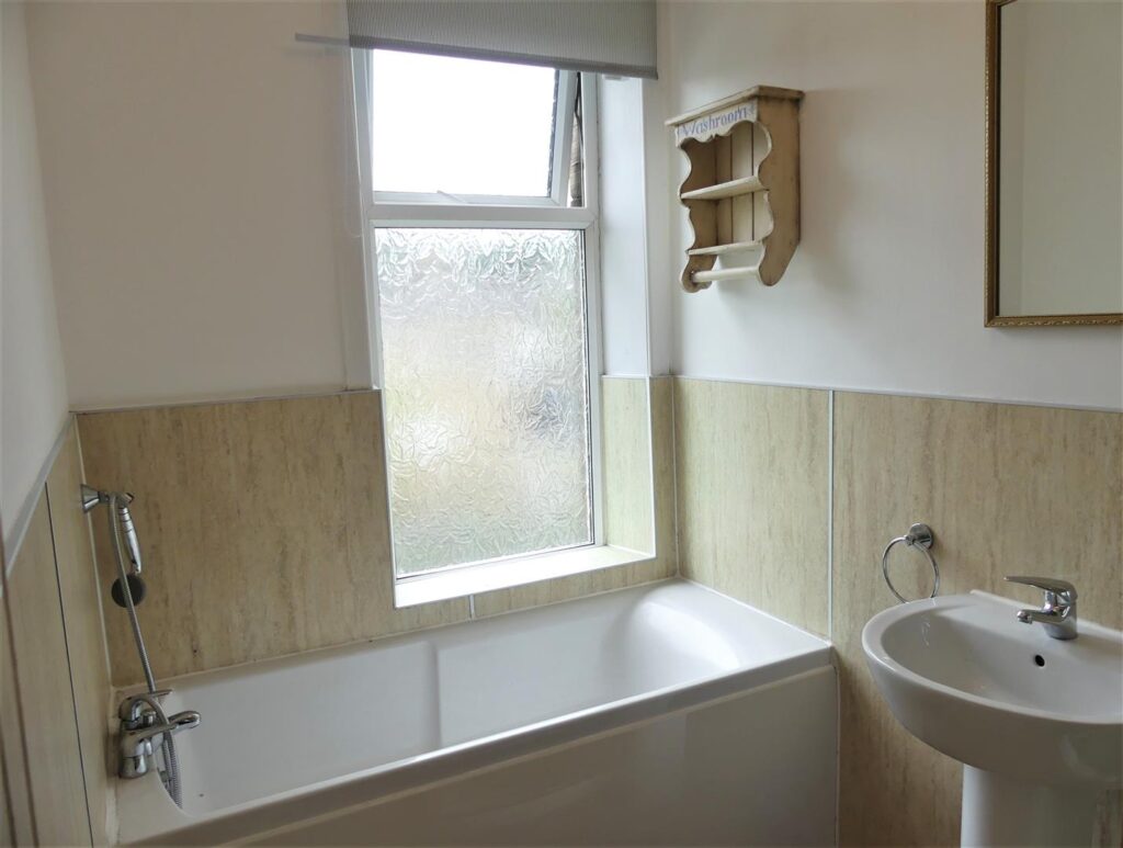 Fitted with a white suite comprising a panelled bath with handheld shower attachment, pedestal basin and shower cubicle. Wood effect laminate flooring, radiator, extractor fan and window to the front elevation.