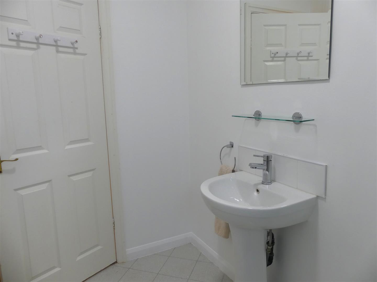 Fitted with a white suite comprising a Quadrant shower enclosure with electric shower, pedestal wash basin and a low suite w.c. There is also an extractor fan, radiator, tile effect vinyl and a window to the rear elevation.