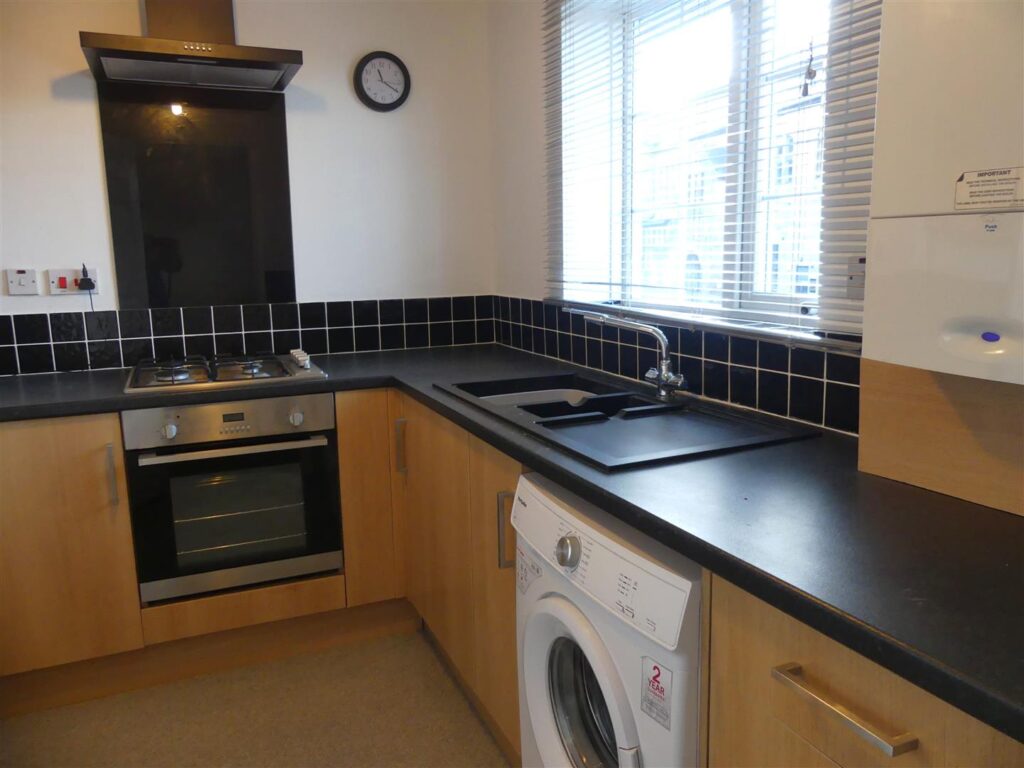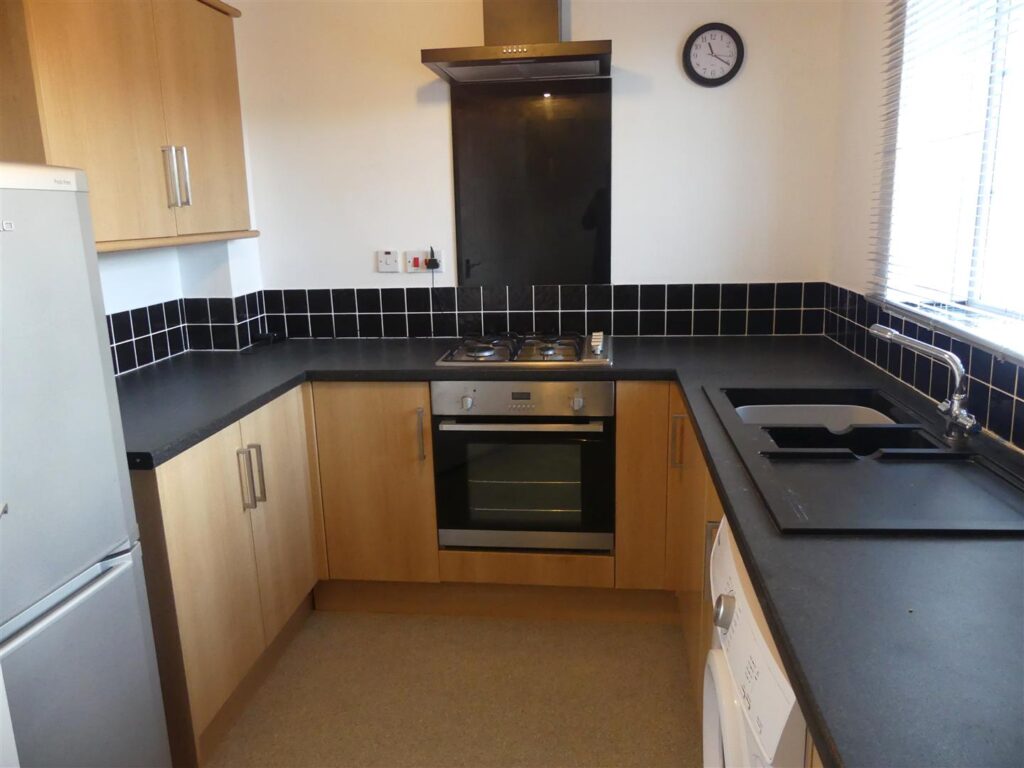 Fitted with a range of wood effect base and wall units having complementary work surfaces, tiled splash backs and a composite sink unit. Appliances comprise an integrated electric oven, gas hob with cooker hood over, fridge freezer and washing machine. There is also a boiler, vinyl flooring and a window to the rear elevation.