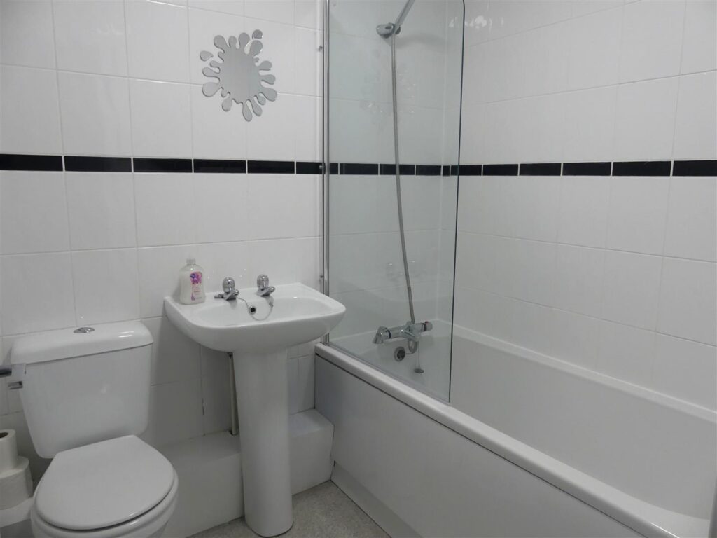Fitted with a white suite comprising a panelled bath with thermostatic mixer shower and a glazed screen, low suite w.c. and a pedestal wash basin. Fully tiled walls, vinyl flooring, radiator and extractor fan.