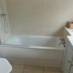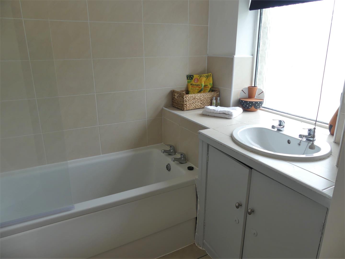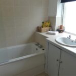 Fitted with a white suite comprising a panelled bath with a thermostatic shower over and a glass screen, low suite w.c. and a vanity unit with basin. There is also a radiator, shaver point and storage cupboard. Window to the side elevation and vinyl flooring.