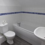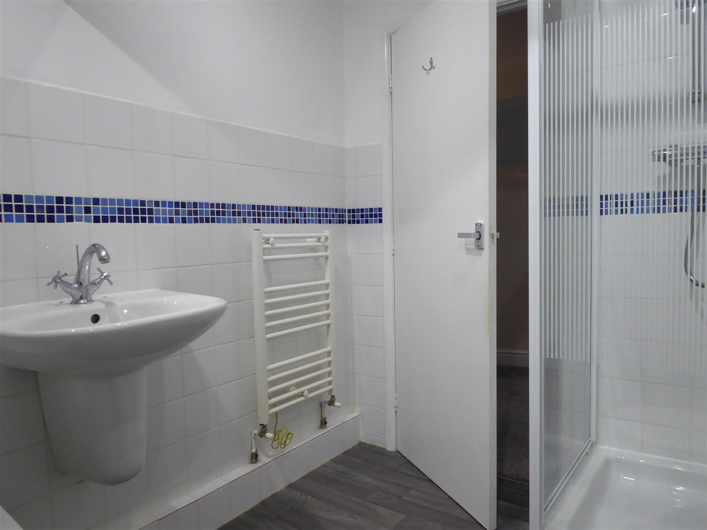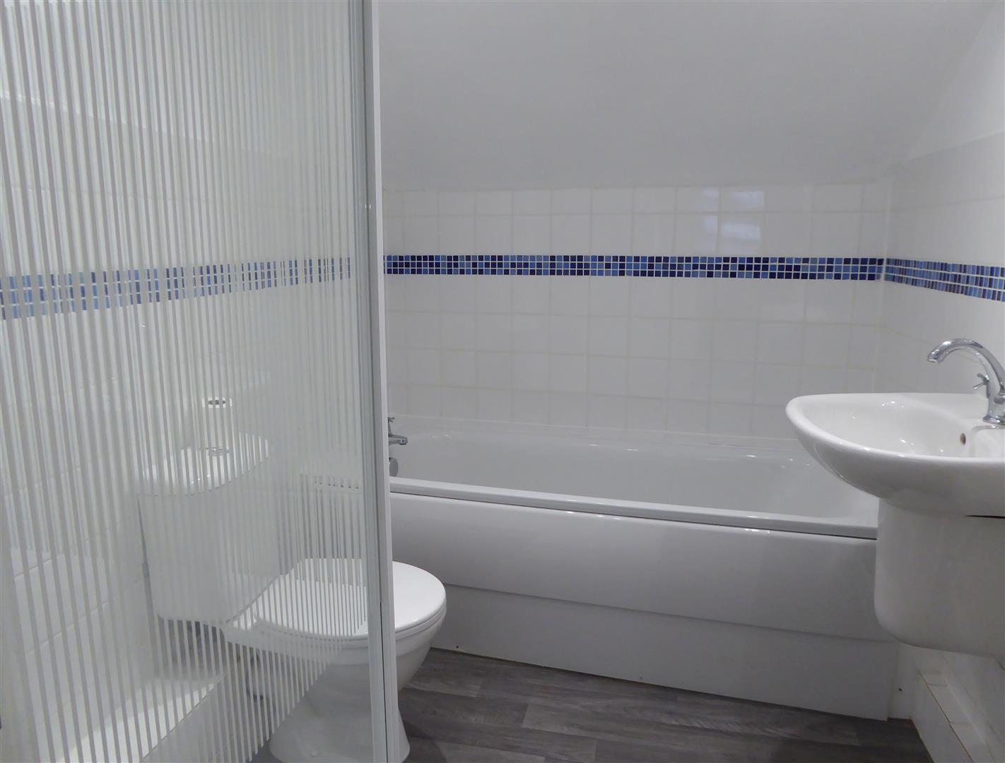 Fitted with a white suite comprising a panelled bath, separate shower enclosure with thermostatic shower, low suite w.c. and wall hung basin. Wood effect vinyl flooring and part tiled walls.