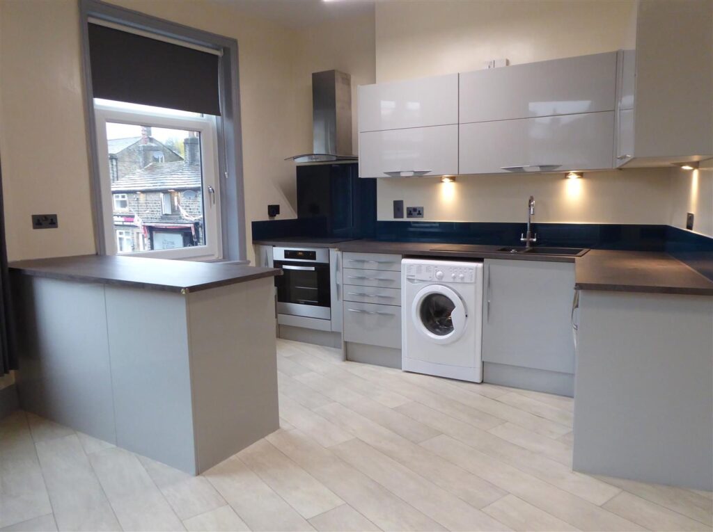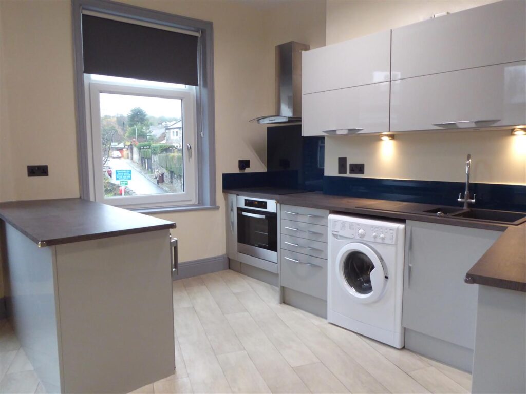 Fitted with a range of grey base and wall units having complementary laminated work surfaces, boarded splash backs and a composite sink unit with mixer tap. Appliances comprise an integrated electric oven with induction hob and a cooker hood over, washing machine, under counter fridge and under counter freezer. There is also a window to the side elevation.