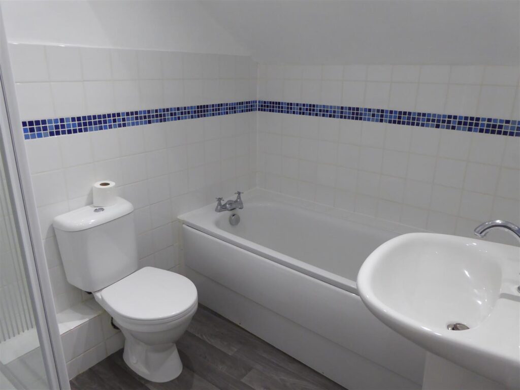Fitted with a white suite comprising a panelled bath, separate shower enclosure with thermostatic shower, low suite w.c. and wall hung basin. Wood effect vinyl flooring and part tiled walls.