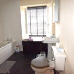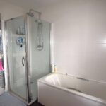 Single glazed sash window with blind to front elevation, spotlights, white panel bath, white pedestal sink with mirror over, white low-level w/c, shower cubicle with fountain head double shower, heated towel rail. Tiled flooring.