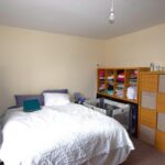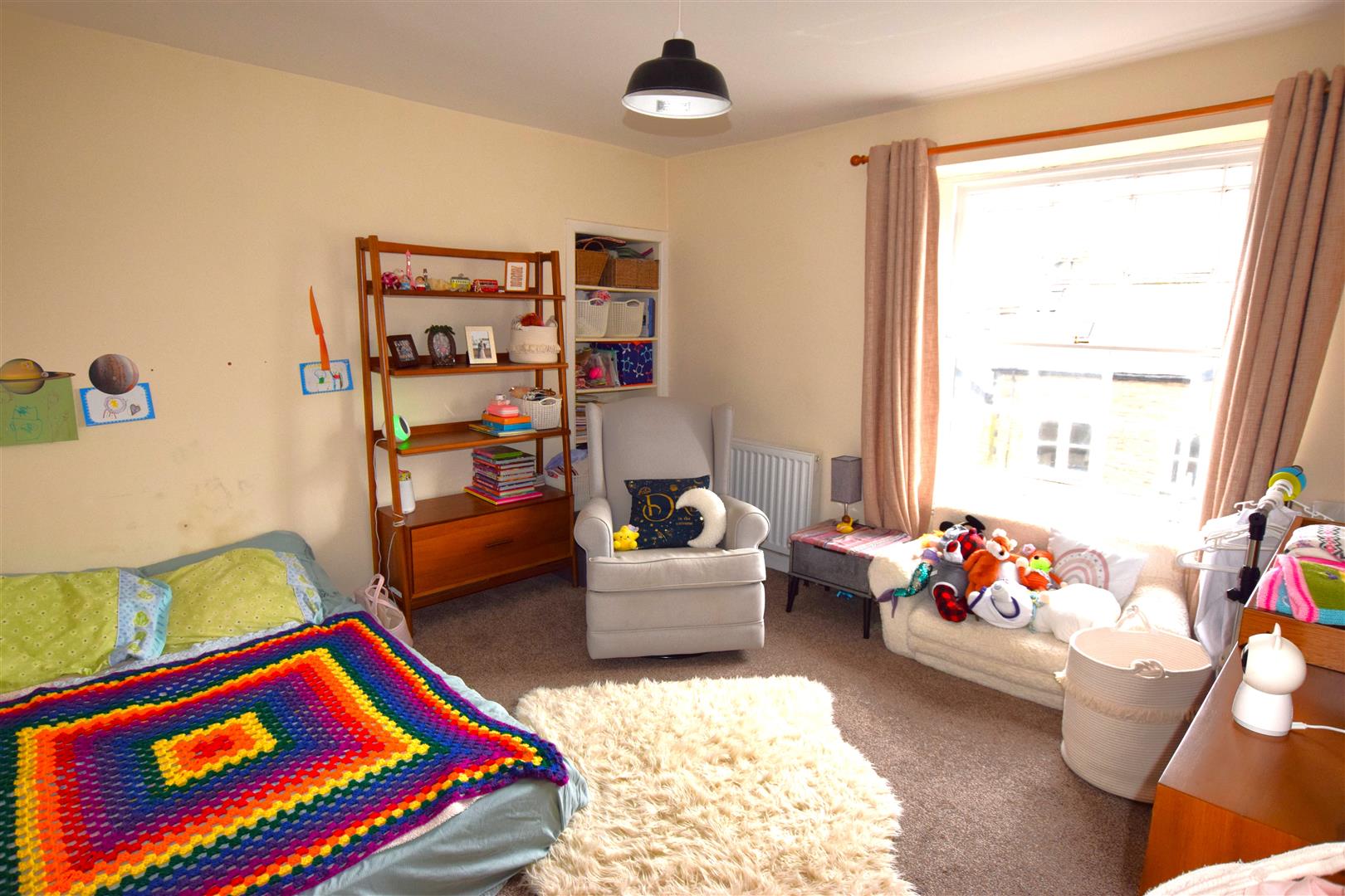Neutral décor, single glazed sash window with curtain pole and curtains to front elevation, one light pendant, one radiator, fitted carpet. shelving in recess.