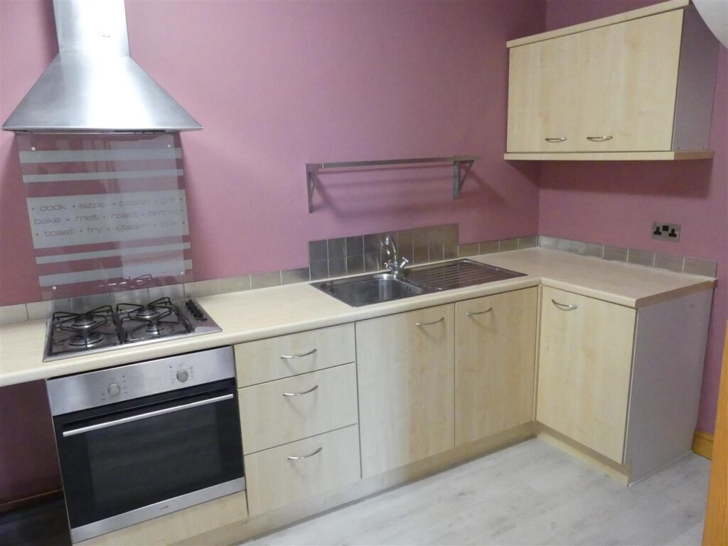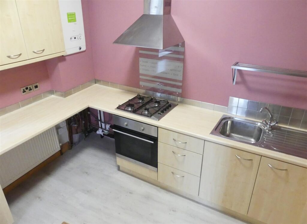 Fitted with a range of wood effect base and wall units having laminated work surfaces, a breakfast bar, tiled splashbacks and a stainless steel sink unit with mixer tap. Appliances comprise an Integrated electric oven and four ring gas hob with cooker hood over. There is also plumbing for a washing machine, space for a fridge freezer, boiler, radiator, laminate flooring and a window to the side elevation.