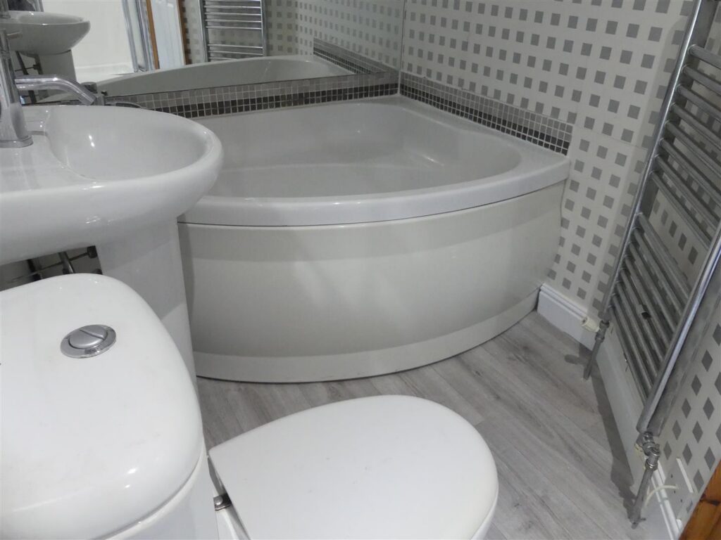 Fitted with a white suite comprising a corner bath, shower enclosure, pedestal wash basin and low suite w.c. There is also a heated towel rail, recessed spotlights and an extractor fan. Window to the side elevation.