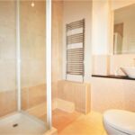With recently fitted white suite comprising, shower cubicle, low flush wc, basin and chrome heated towel rail.