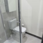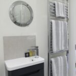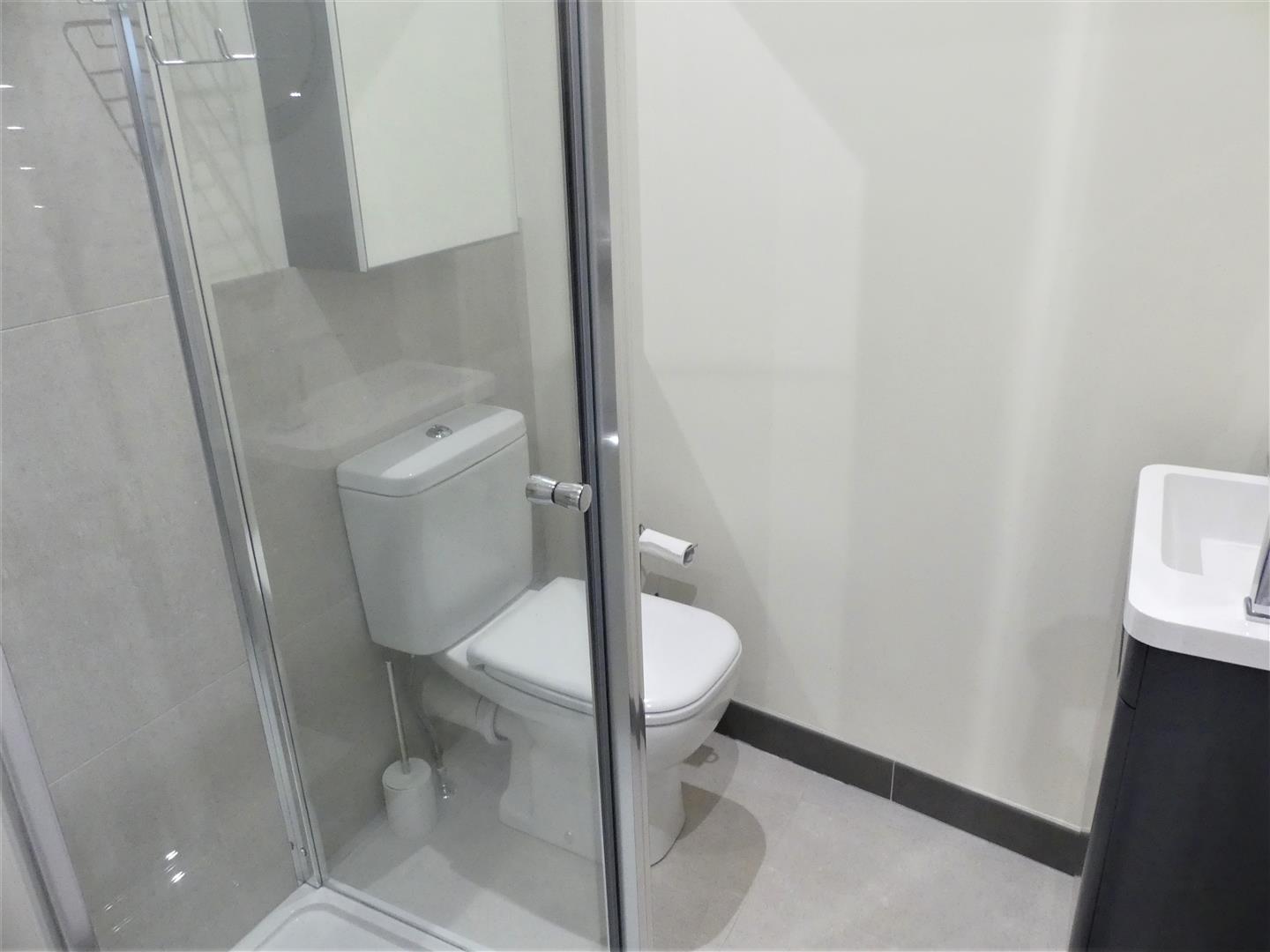 Fitted with a shower enclosure, low suite w.c. and vanity unit with basin and mixer tap. There is also a mirrored cabinet, heated towel rail, extractor fan, tiled floor and part tiled walls.