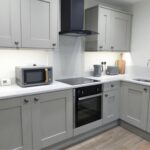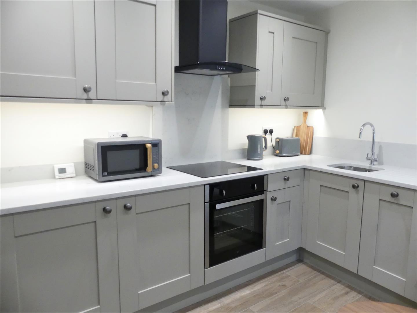 The well planned living area has an attractive wood effect tiled floor and a window to the front elevation. There are television and telephone points and high level storage area. The kitchen area is fitted with a range of base and wall units having a stainless steel sink unit and mixer tap. Integrated appliances comprise an electric oven, ceramic hob with cooker hood over, washing machine, dishwasher and an under counter fridge with freezer compartment. A microwave oven, kettle and toaster are also included.