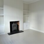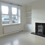 Having a recessed fireplace with gas stove, radiator, painted floorboards, television and telephone points. A low built in cupboard and open shelving provides storage and there is a window to the front elevation.