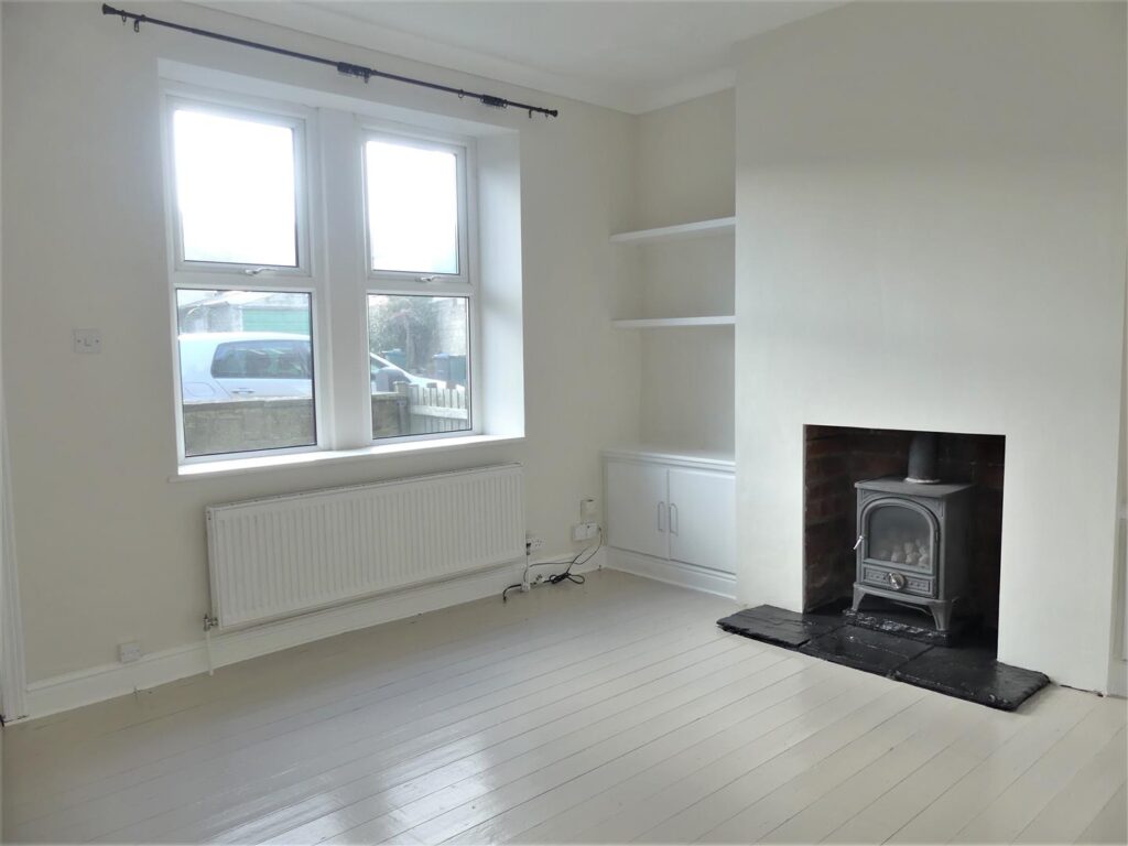 Having a recessed fireplace with gas stove, radiator, painted floorboards, television and telephone points. A low built in cupboard and open shelving provides storage and there is a window to the front elevation.