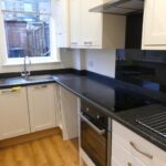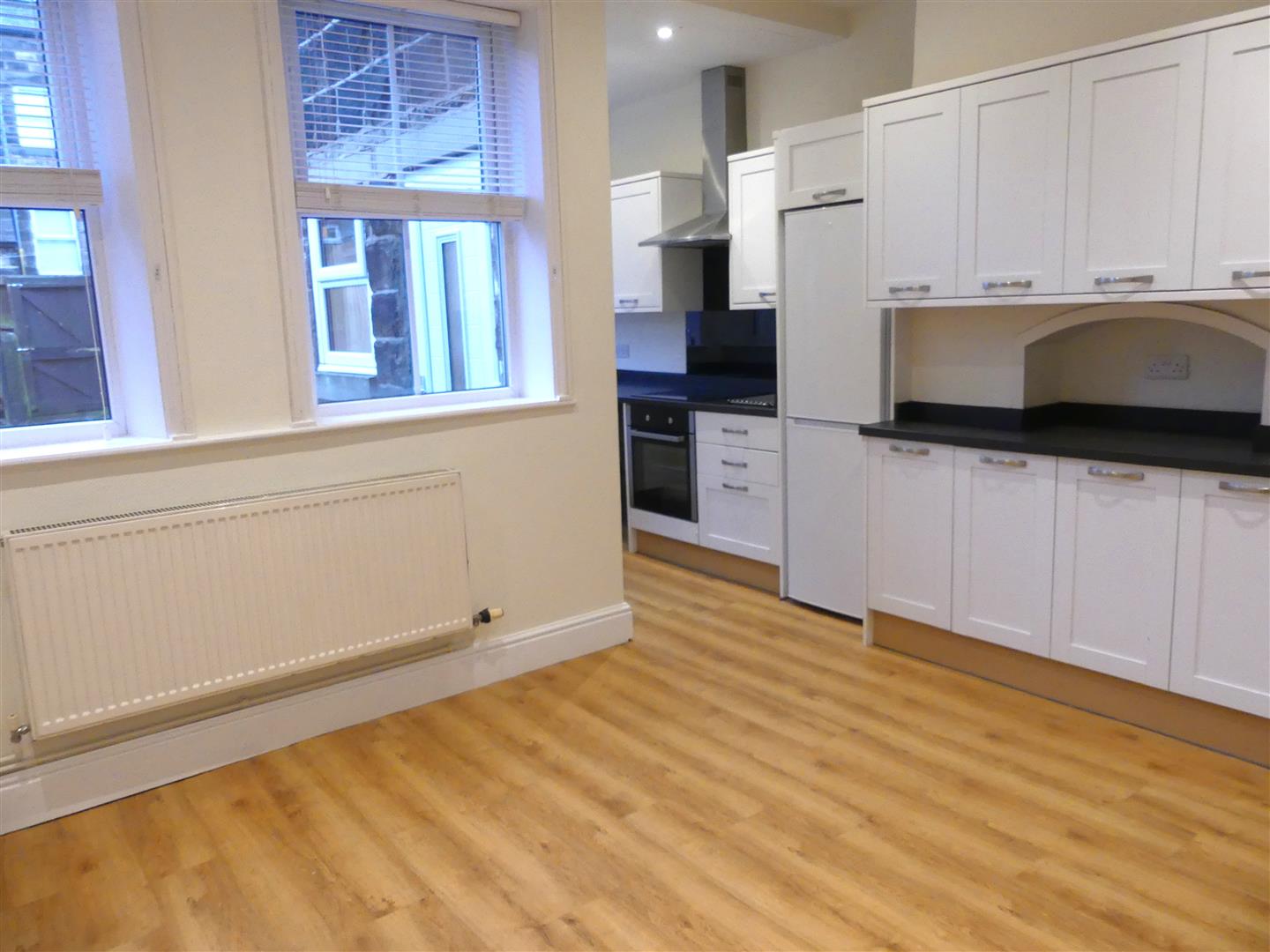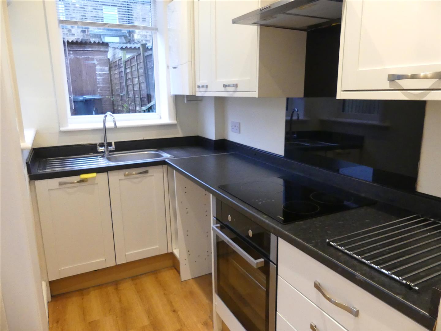 Fitted with a range of white Shaker style base and wall units with complementary work surfaces and stainless steel sink with mixer tap. Appliances comprise an electric oven, ceramic hob with cooker hood over, integrated slimline dishwasher and a fridge freezer. There are also two windows and a door leads out to the rear .