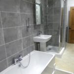 Fitted with a white suite comprising a shower enclosure with thermostatic shower, low suite w.c. and vanity unit with wash basin. There is also a towel rail, extractor fan, vinyl flooring and mirror.