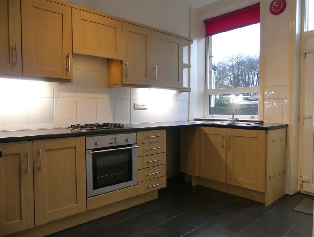 Fitted with a range of light wood effect base and wall units having complementary work surfaces, under cupboard lighting, tiled splashbacks and a stainless steel sink unit with mixer tap. Appliances comprise an integrated electric oven, gas hob and cooker hood and there is plumbing for a washing machine. Tiled floor, radiator, window to the rear elevation and a door leading out to the rear.