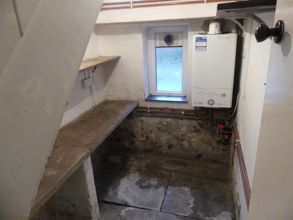 Housing the boiler and having a stone keeping shelf and stone flagged floor.