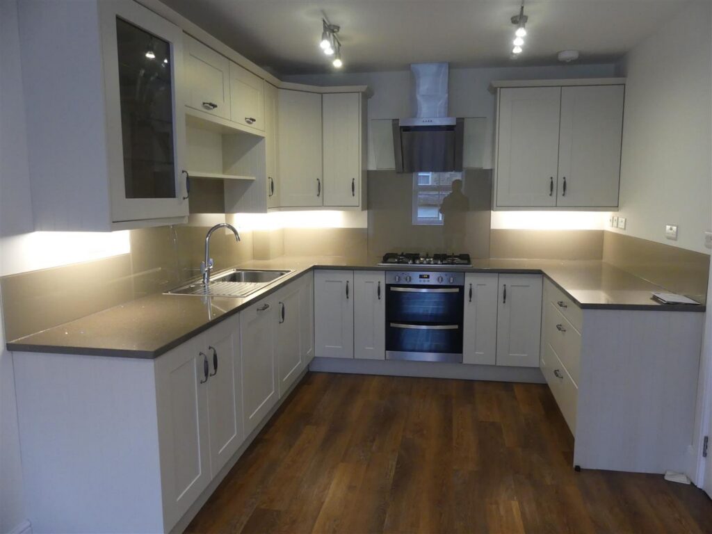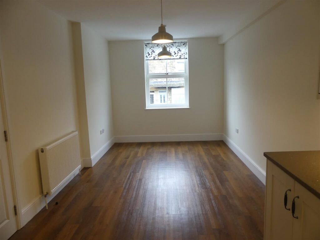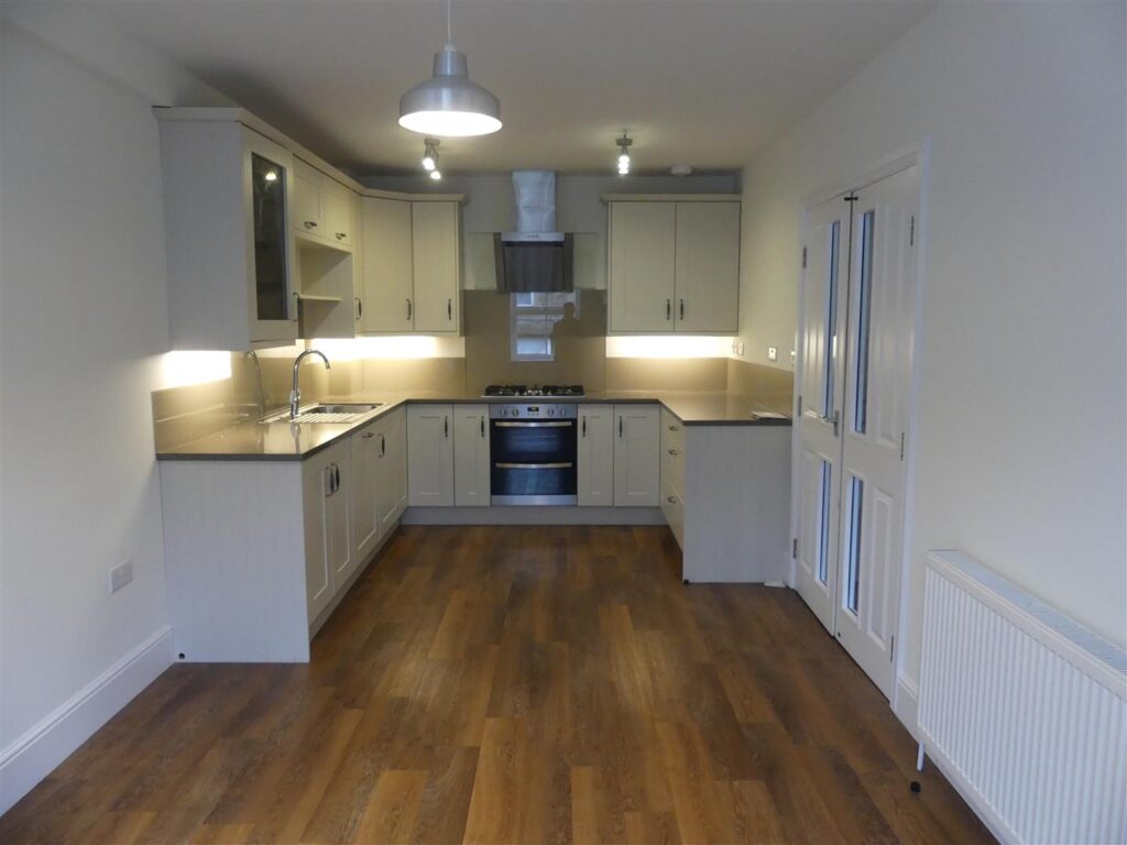 Fitted with a range of base and wall units having quartz work surfaces and stainless steel sink unit with mixer tap. Integral appliances comprise electric oven, five ring gas hob with cooker hood and dishwasher. There is also a radiator, television point, wood effect flooring and a window to the front.