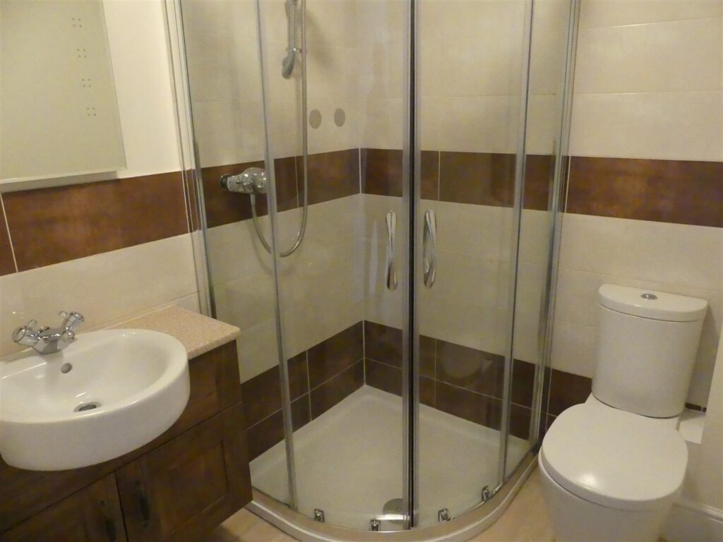 Fitted with a shower cubicle, wash basin and low suite w.c. Heated towel rail, extractor fan and shaver point.