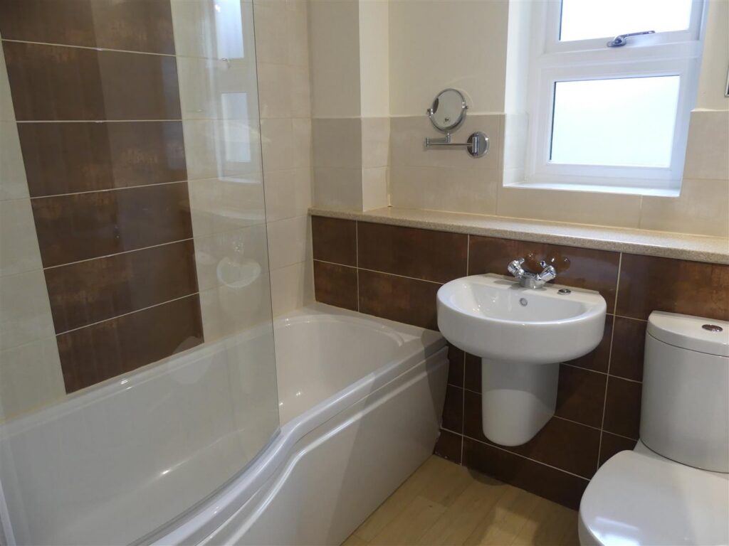 Fitted with a white suite comprising panelled P-shaped bath with shower over, wash basin and low suite w.c. Heated towel rail, extractor fan and shaver point.