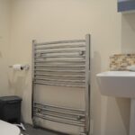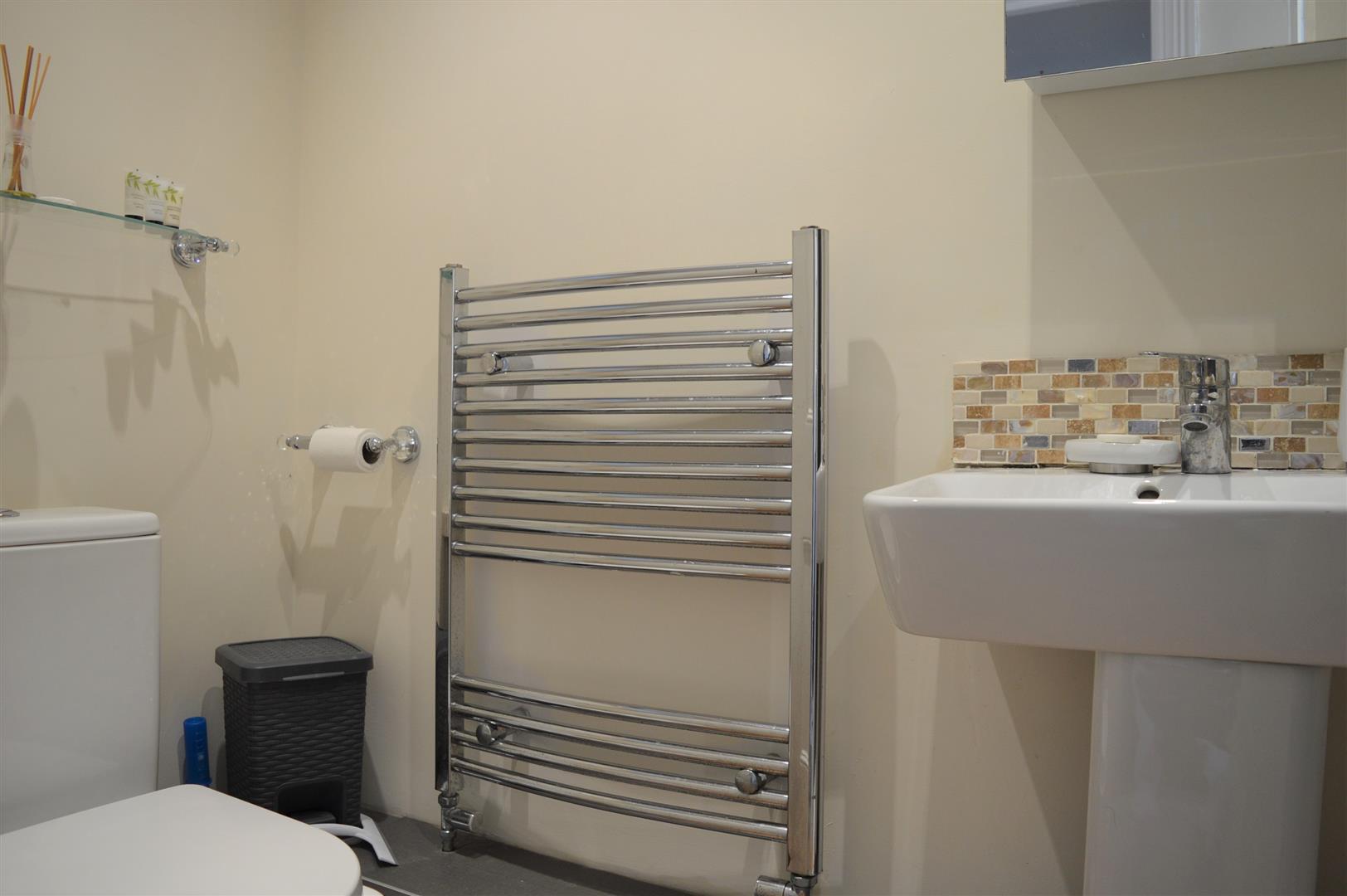 With shower cubicle, basin, wc, cabinet and heated towel rail.