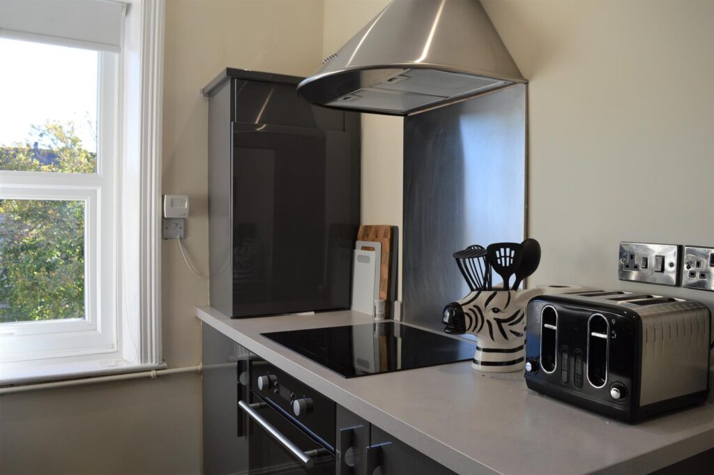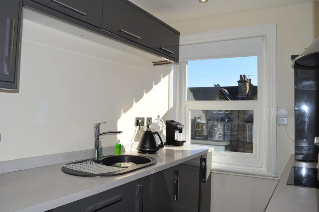 With a range of wall mounted cupboards, base units and drawers, fridge with freezer box, electric oven, hob, extractor canopy and UPVC double glazed window to the front of the property.