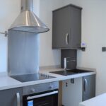 Modern kitchen with a range of wall mounted cupboards, base units and drawers, with integrated fridge, electric oven, hob and UPVC door to the fire escape.