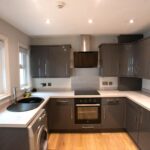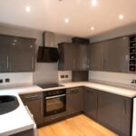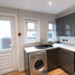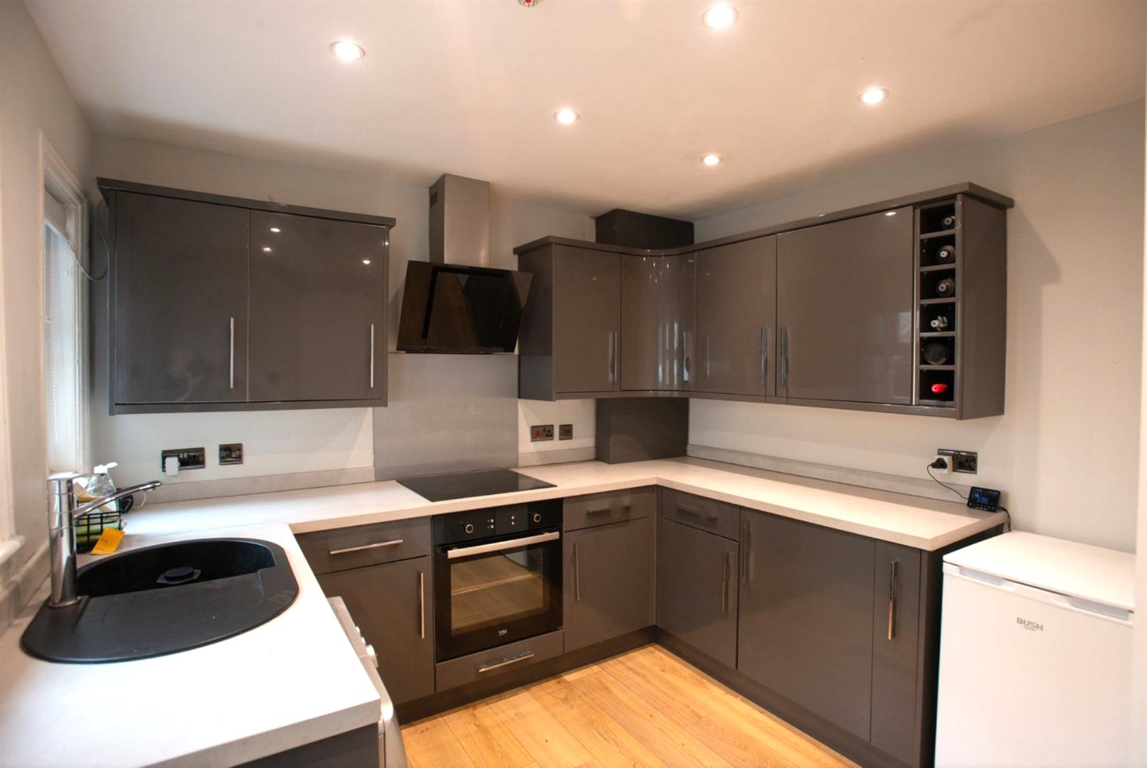 With a range of wall mounted cupboards, base units and drawers, electric oven, hob, extractor, integrated fridge, UPVC double glazed windows to the side and UPVC double glazed door to the rear yard.