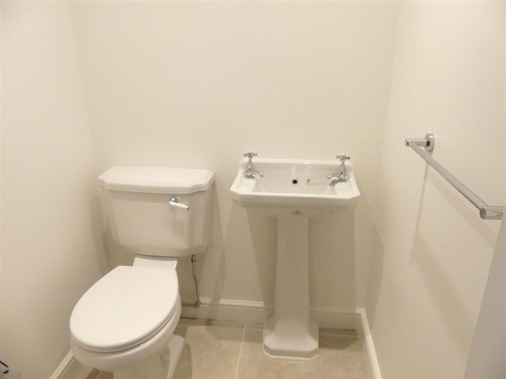 Fitted with a white low suite w.c. and pedestal basin and having tiled floor, recessed spots and an extractor fan.