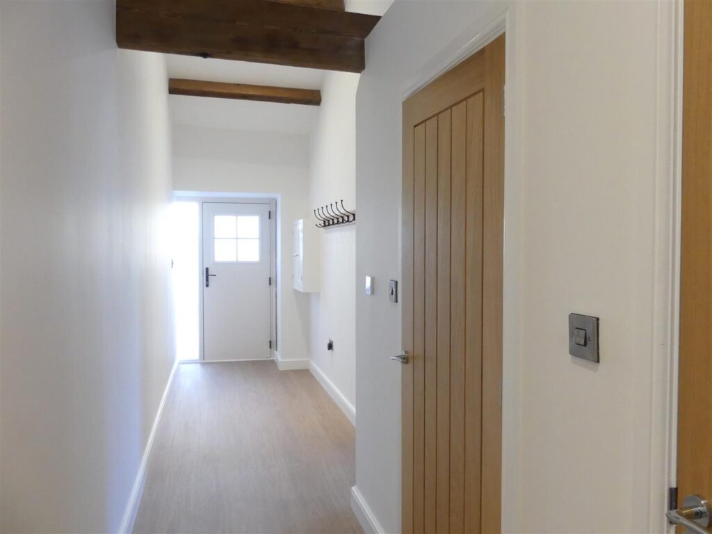 Having attractive wood effect flooring, beamed ceiling, recessed spotlights and utility cupboard.