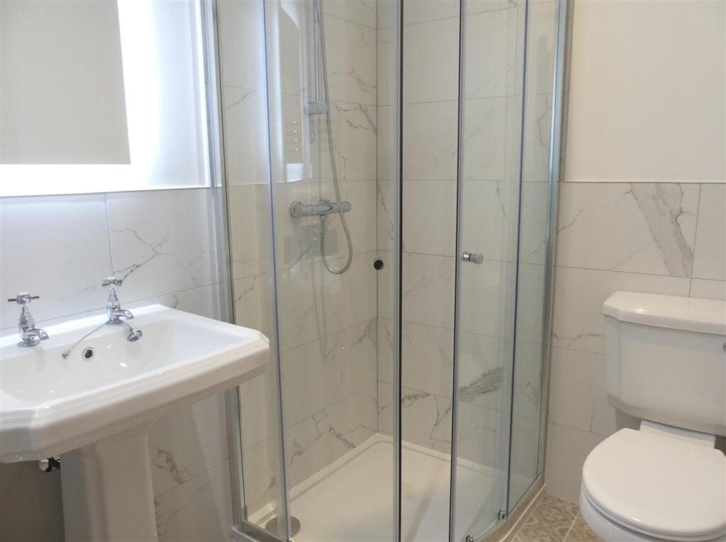 The modern shower room is fitted with a shower enclosure, low suite w.c. and pedestal wash basin. There is also an illuminated mirror, extractor fan, heated towel rail and recessed spotlights.