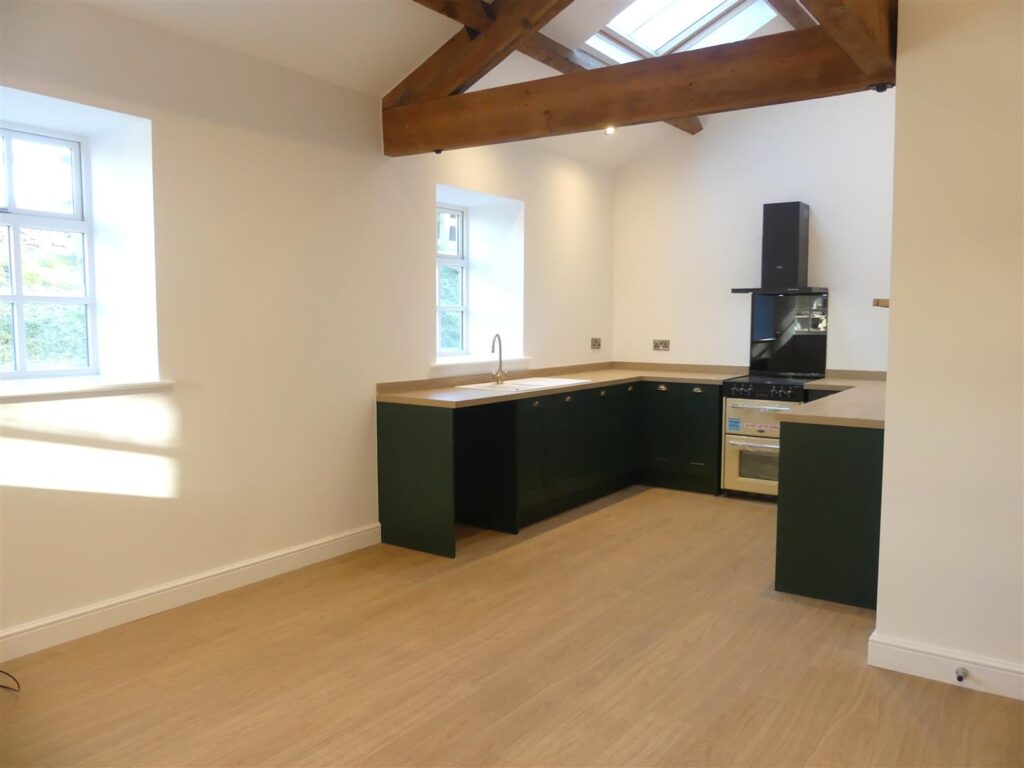 This lovely bright room has four windows to the front and side elevations as well as a Velux window and has an attractive beamed ceiling. The kitchen is fitted with a range of dark green base and wall units having complementary wood effect work surfaces and upstands and a sink unit with brass mixer tap. Appliances comprise an electric oven and grill and a four ring hob with cooker hood over. There is also plumbing for a washing machine. Wood effect flooring and recessed spotlights.