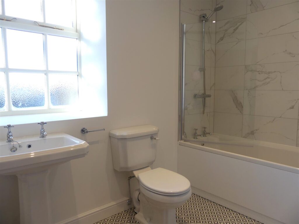 Fitted with a white suite comprising a panelled bath with shower over and glazed screen, low suite w.c. and a pedestal wash basin. There is also an extractor fan, shaver point, recessed spotlights, heated towel rail, tiled floor and a window.