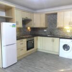 Fitted with a range of base and wall units having complementary work surfaces, tiled splash backs and stainless steel sink unit. Appliances comprise an integrated electric oven, hob, cooker hood, fridge freezer and washing machine.