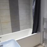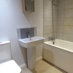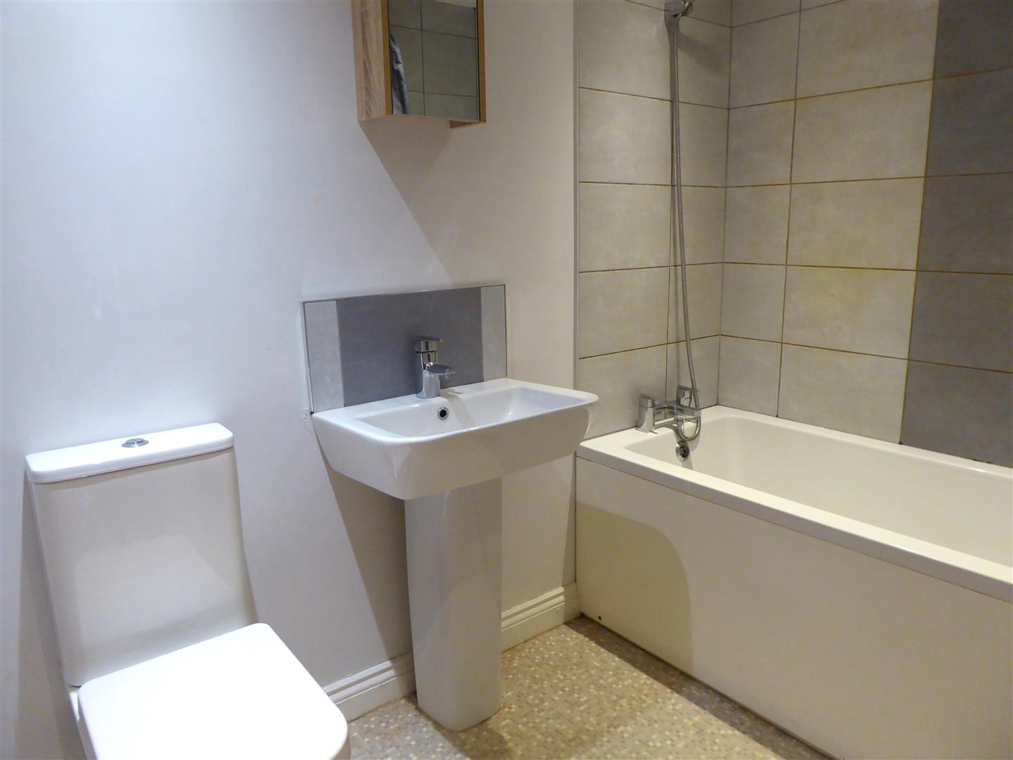 Fitted with a white suite comprising a panelled bath with a mixer shower over and a shower curtain, pedestal wash basin and low suite w.c. There is also a mirrored cabinet, heated towel rail, extractor fan and recessed spot lights. Vinyl flooring and part tiled walls.