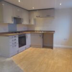 Fitted with a range of grey base and wall units having complementary wood effect work surfaces and stainless steel sink unit with mixer tap. Appliances comprise an integrated electric oven with gas hob and a cooker hood over. There is also plumbing for a washing machine and space for a fridge freezer. Wood effect vinyl flooring, recessed spot lights, window to the front elevation and part glazed front door.