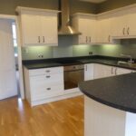 Fitted with a range of modern base and wall units having complementary work surfaces, breakfast bar and stainless steel sink unit with mixer tap. Integrated appliances comprise an electric oven, induction hob with cooker hood over, under counter fridge and under counter freezer.