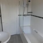 Fitted with a white suite comprising a panelled bath with electric shower over and a glazed screen, pedestal wash basin and low suite w.c. There is also a mirror fronted cabinet with shaver point, wood effect vinyl flooring and a window to the rear elevation.