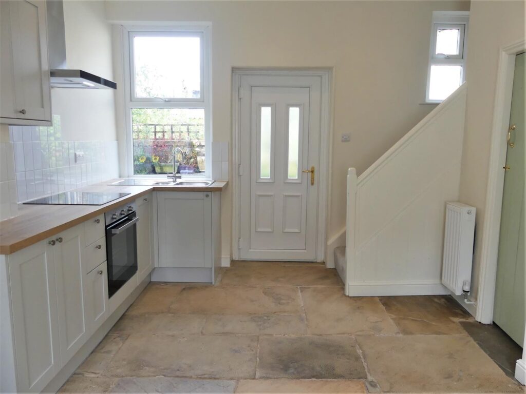 Fitted with a range of pale grey Shaker style base and wall units having complementary wood effect work surfaces and stainless steel sink unit with mixer tap. Appliances comprise a slimline dishwasher, electric oven, induction hob and cooker hood. Space for a fridge freezer. Stone flooring, window and door to the rear. Just off the kitchen there is a small keeping cellar.