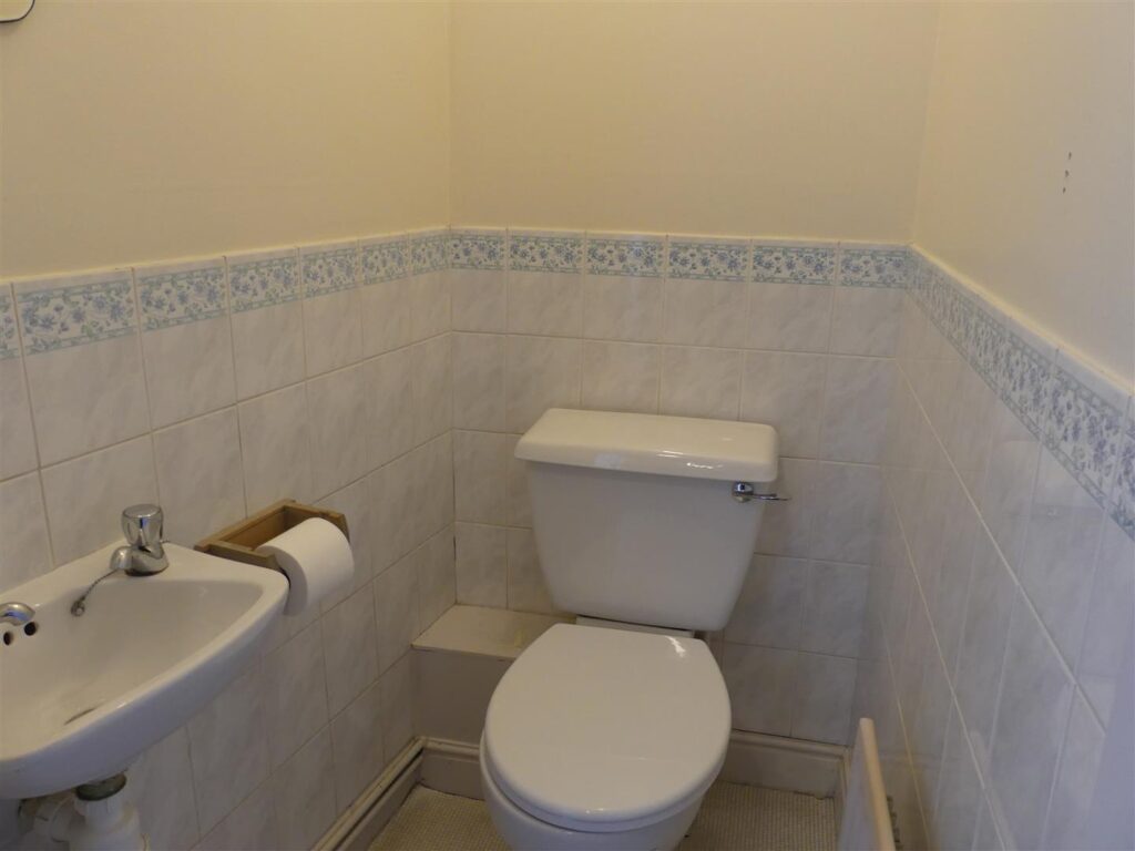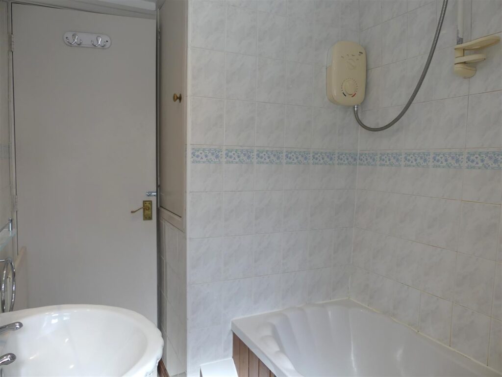 Fitted with a white suite comprising a panelled bath with electric shower over, low suite w.c. and a pedestal wash basin. There is also a mirror, light with shaver point, radiator, extractor fan, recessed storage cupboard and a window to the rear elevation. Vinyl flooring and fully tiled walls.