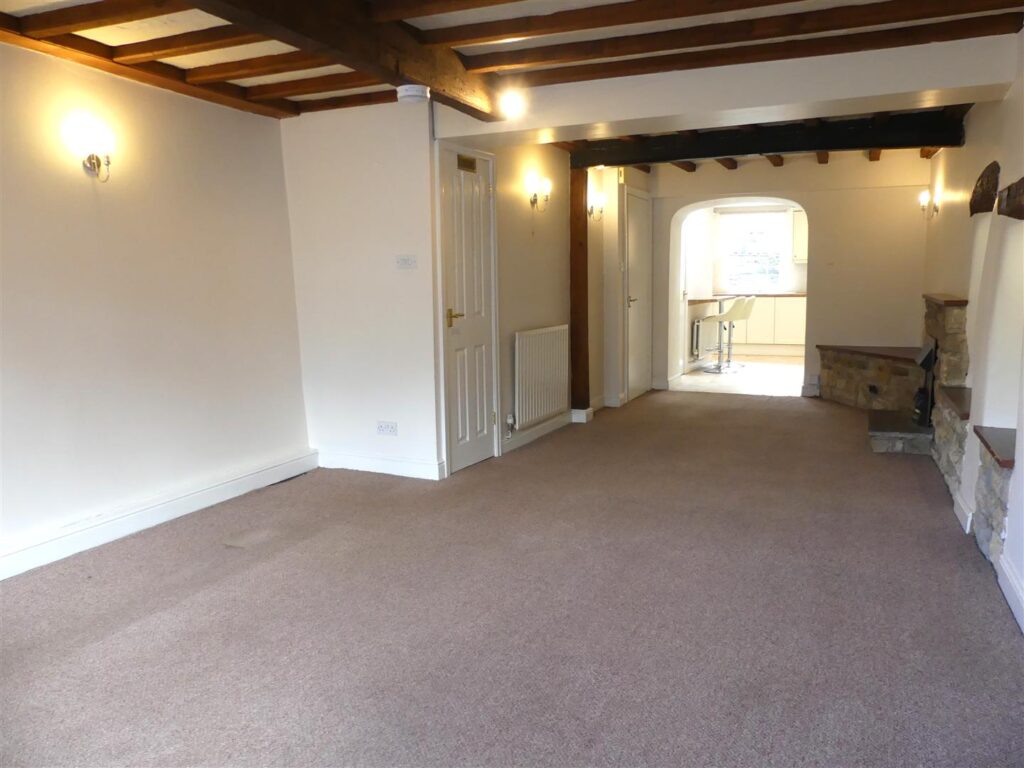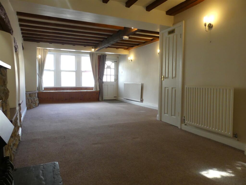 The spacious living room has an electric fire set in a stone fireplace with stone hearth, wooden beamed ceiling, lit recesses, window seat, wall lights, television and telephone point, two radiators a useful understairs cupboard with coat hooks and a window to the front elevation.