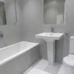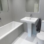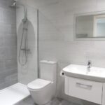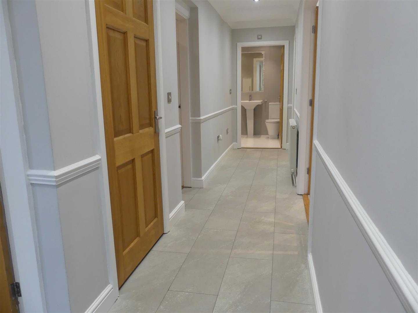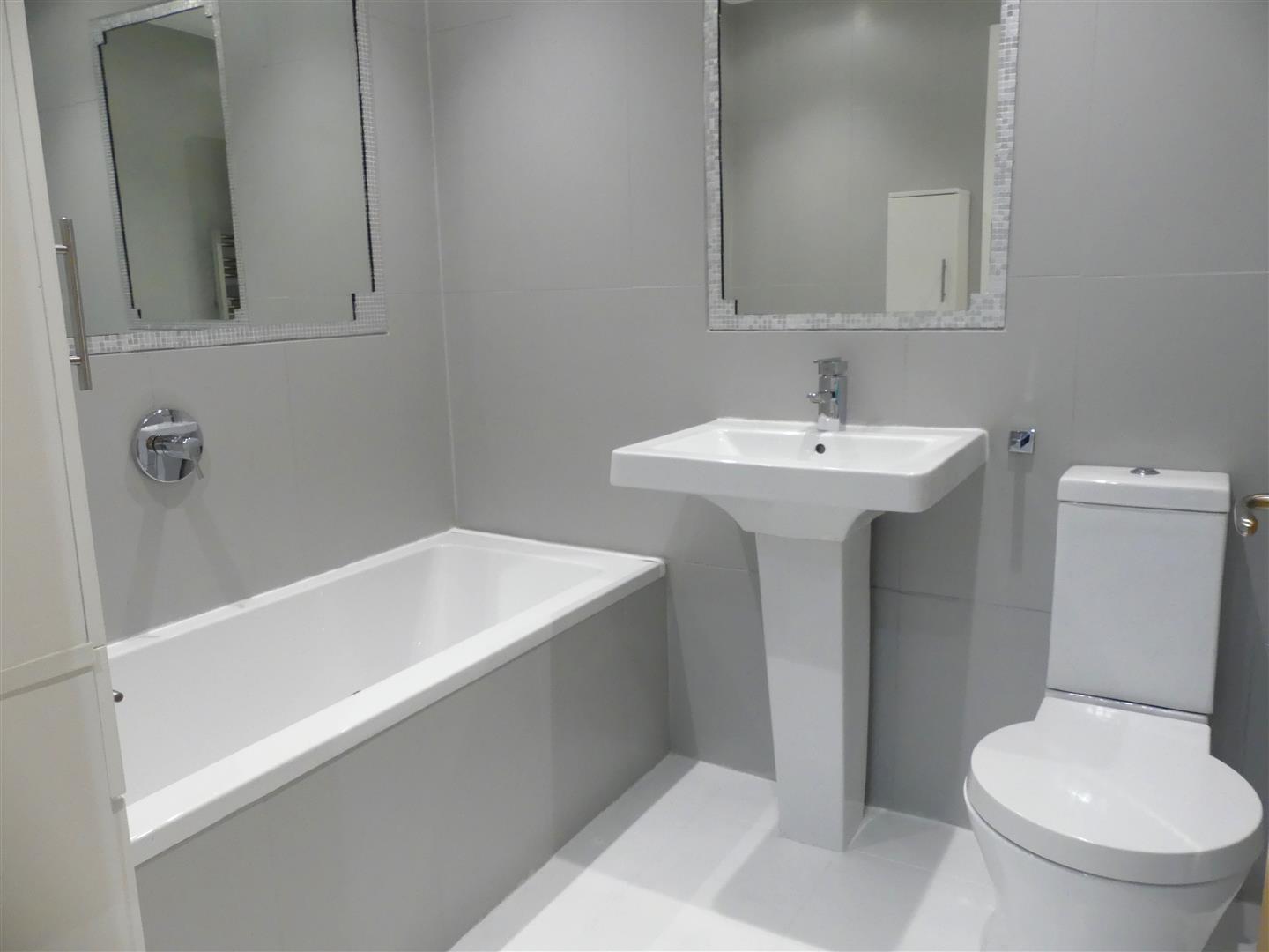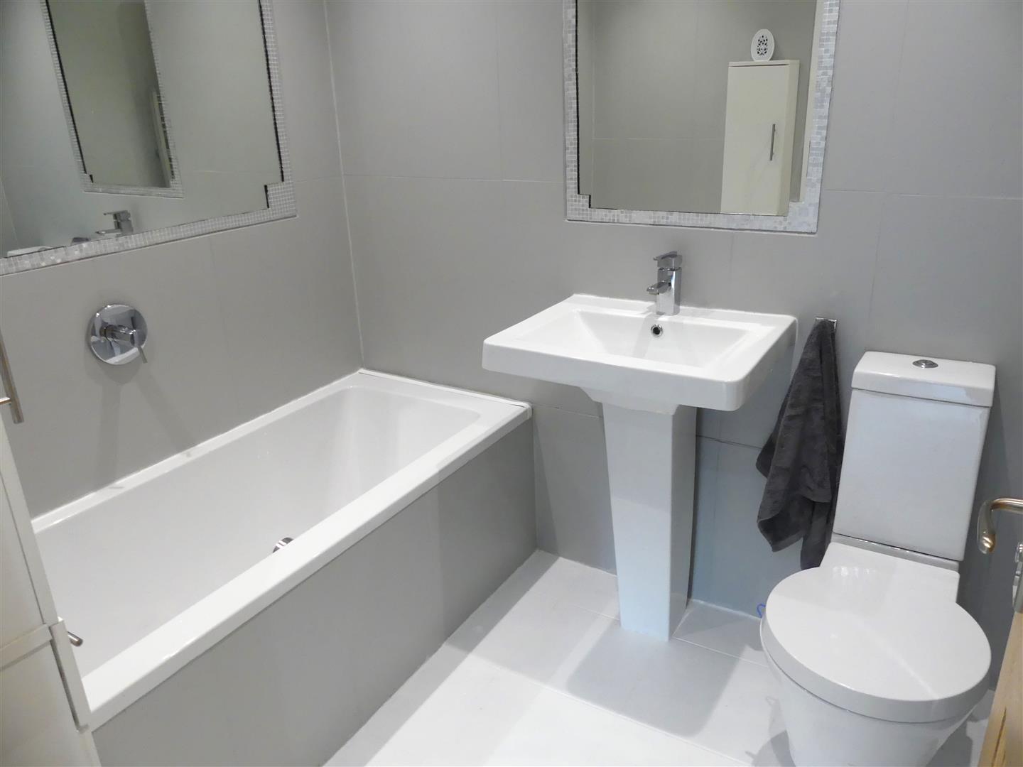 Fitted with a white suite comprising a tile panelled bath, pedestal wash basin and low suite w.c. There are also two mirrors, storage cupboards, heated towel rail, extractor fan and a ceramic tiled floor.