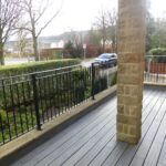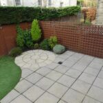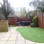There is a large private garden with artificial grass in part and patio areas, one of which has a table and chairs. There is also a wooden shed.
