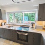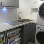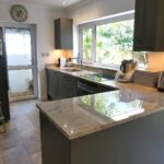 Fitted with base and wall units having complementary work surfaces, tiled splashbacks and sink unit with mixer tap. Ceramic tiled floor with underfloor heating, washing machine, tumble dryer and an extractor fan.