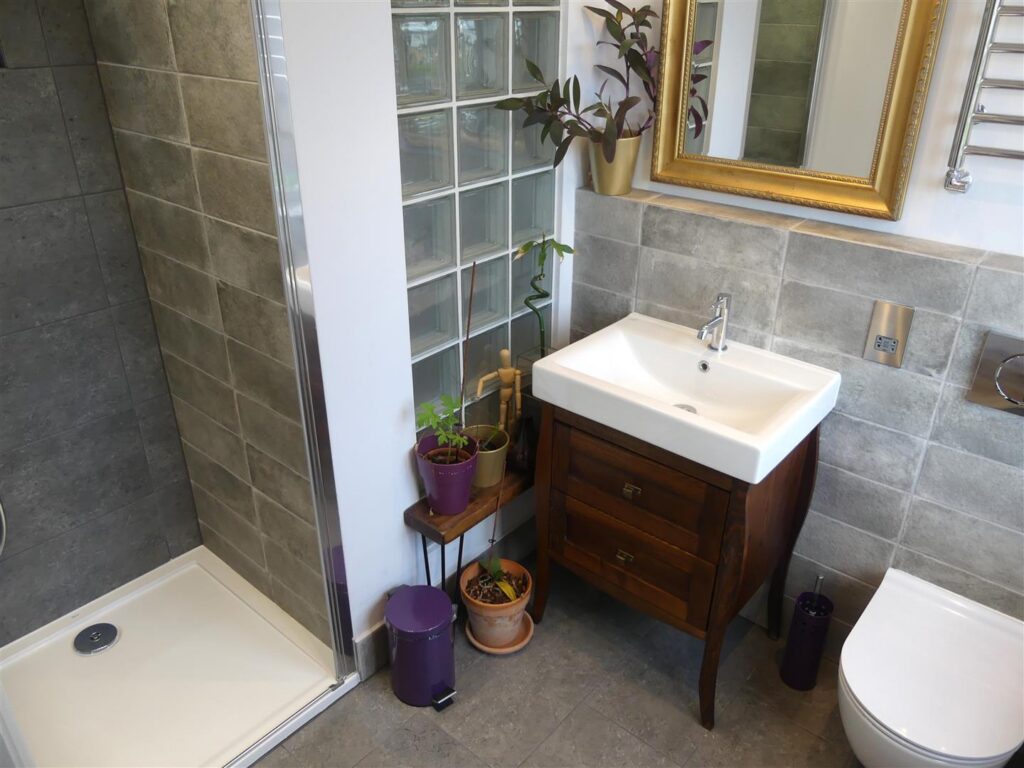 Fitted with a recessed shower enclosure and thermostatic shower, wash basin with vanity unit and a low suite w.c. Fully tiled with underfloor heating, heated towel rail, shaver point and a window to the front elevation.