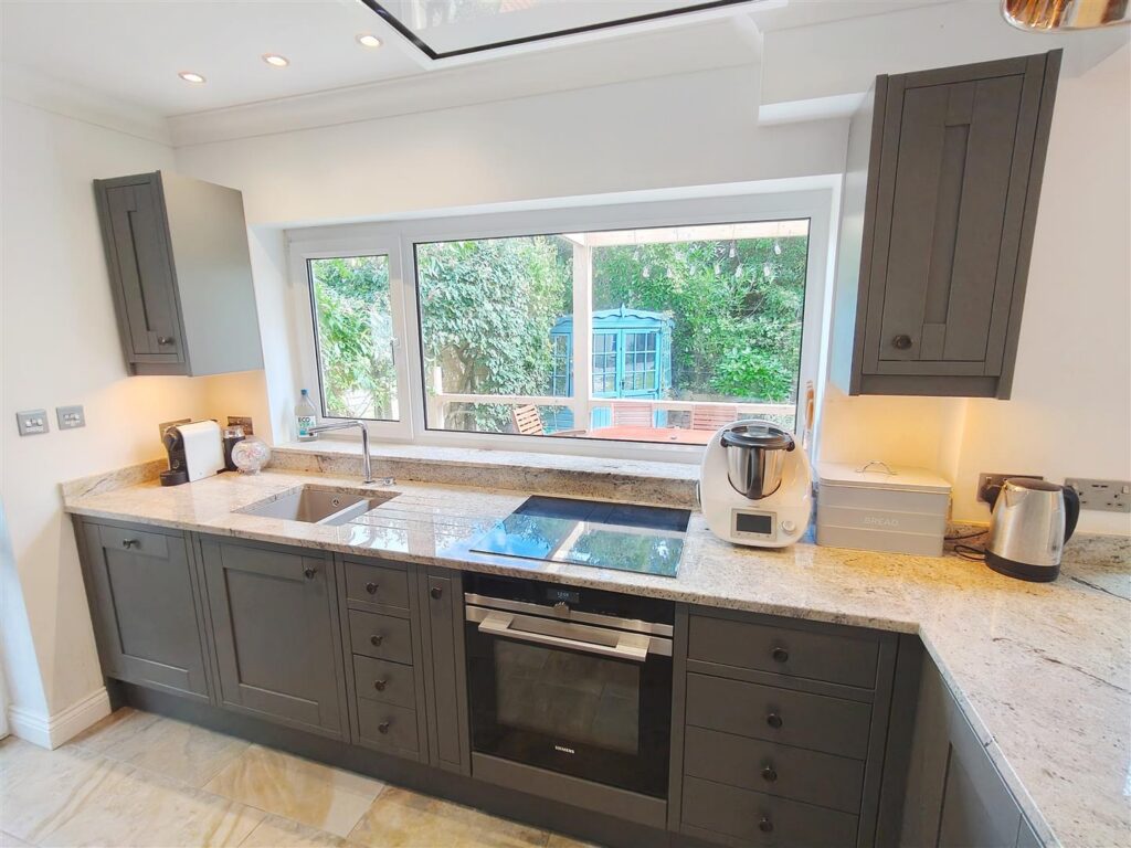 With a range of modern solid wood base and wall units having granite work surfaces and a sink unit with retractable tap. Smart integrated appliances comprise an electric oven with induction hob and cooker hood, American style fridge freezer and dishwasher. Ceramic tiled floor with underfloor heating, pantry, window to the rear elevation and a door to the side.