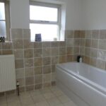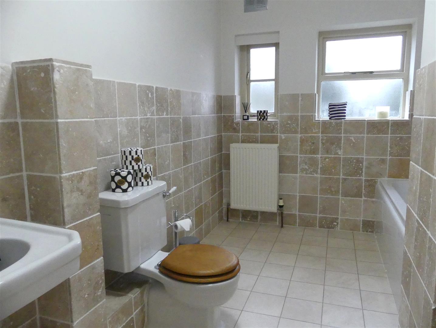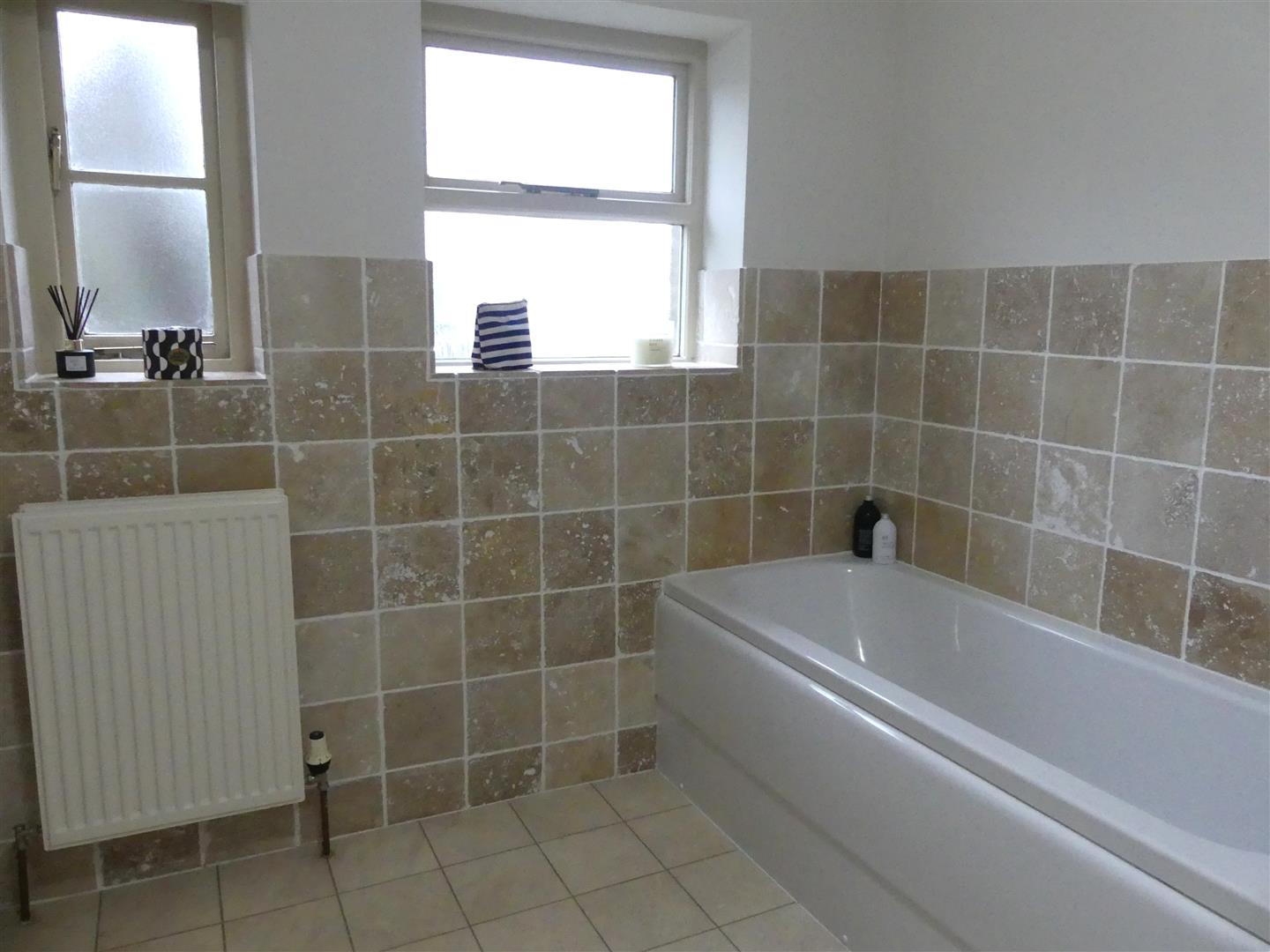 The stylish bathroom is fitted with a white suite comprising a panelled bath with mixer shower head, pedestal basin and low suite w.c. There is also a large wall-mounted mirror, radiator, extractor fan, shaver point, part tiled walls and two windows.
